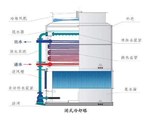 閉式冷卻塔由于區(qū)分內(nèi)外循環(huán),耗電部分比開塔多一個外循環(huán)泵,故耗電相對較高。節(jié)能方面兩方綜合的話差不多,所以要根據(jù)實際使用的情況、冷卻水供水點的實際要求選擇。閉式冷卻塔由于循環(huán)水封閉,內(nèi)循環(huán)水質(zhì)無污染(設備污染除外),所以相同制冷能力下,閉式冷卻塔比開式冷卻塔循環(huán)水排污要低很多,基本不是一個數(shù)量級的。從系統(tǒng)角度看的話,閉式冷卻塔對循環(huán)水用水點的設備保護要好一點,把時間軸拉長了來看,閉式冷卻塔相對還是要好一些。不過閉式冷卻塔也有局限性,閉式冷卻塔的造價普遍都在開塔的3-5倍之間,所以循環(huán)量較大的話,投資就會大很多。